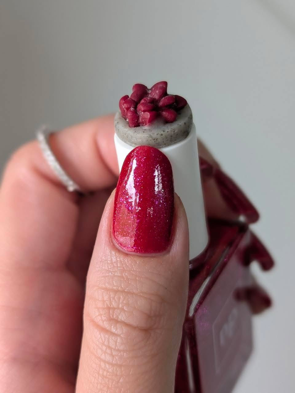 Really great formula and color. The flakies go on evenly and there is plenty in there to admire. I liked how it looked in 2 coats. The details on the cap are incredible, especially the tiny strawberries.